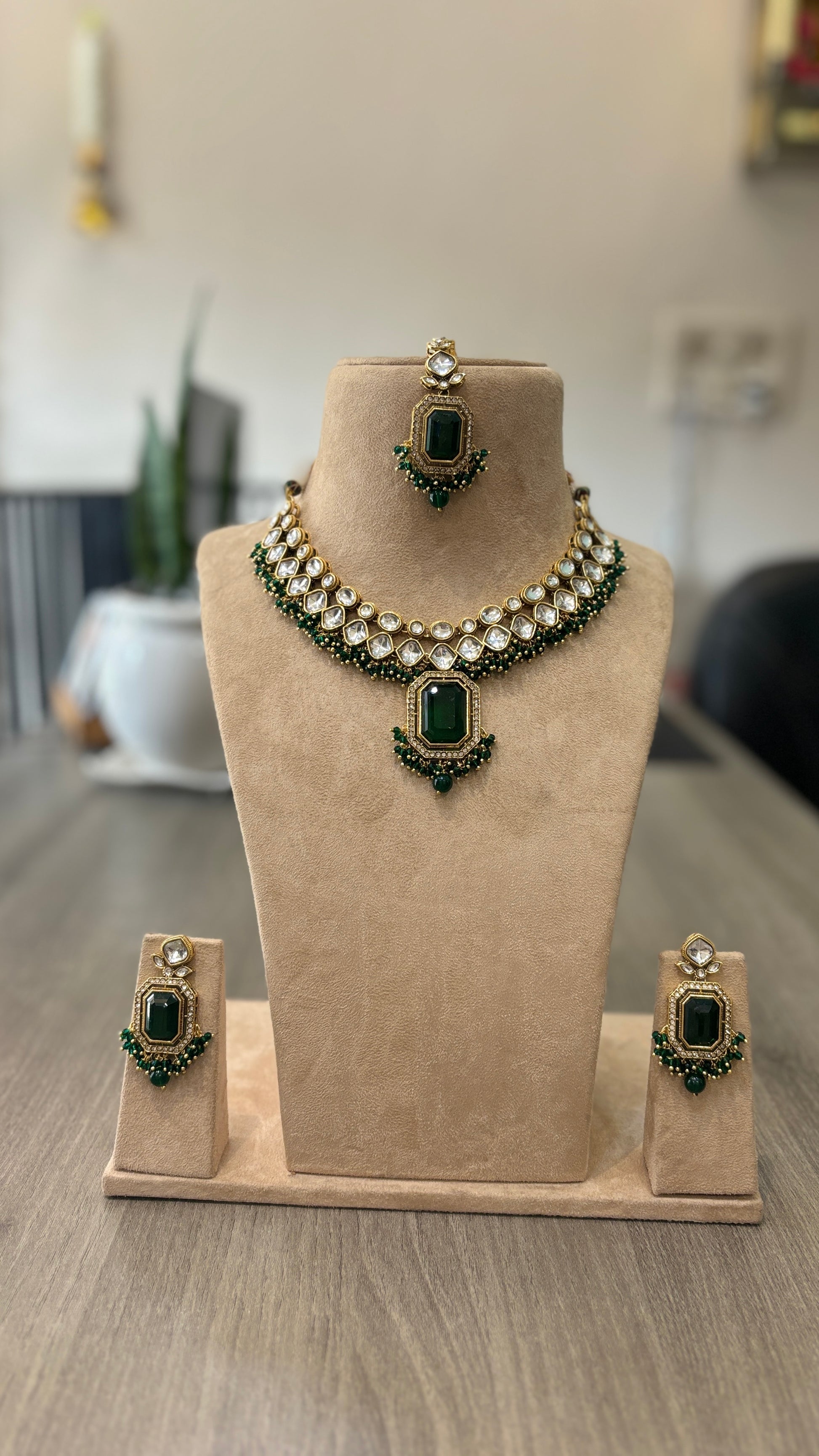 Radiate timeless elegance with this handcrafted Emerald Green Kundan Necklace Set, designed to make every moment feel royal. The intricate choker features emerald-cut green stones, surrounded by classic white kundan and detailed gold craftsmanship, enhanced with delicate green beaded accents for a touch of grandeur.