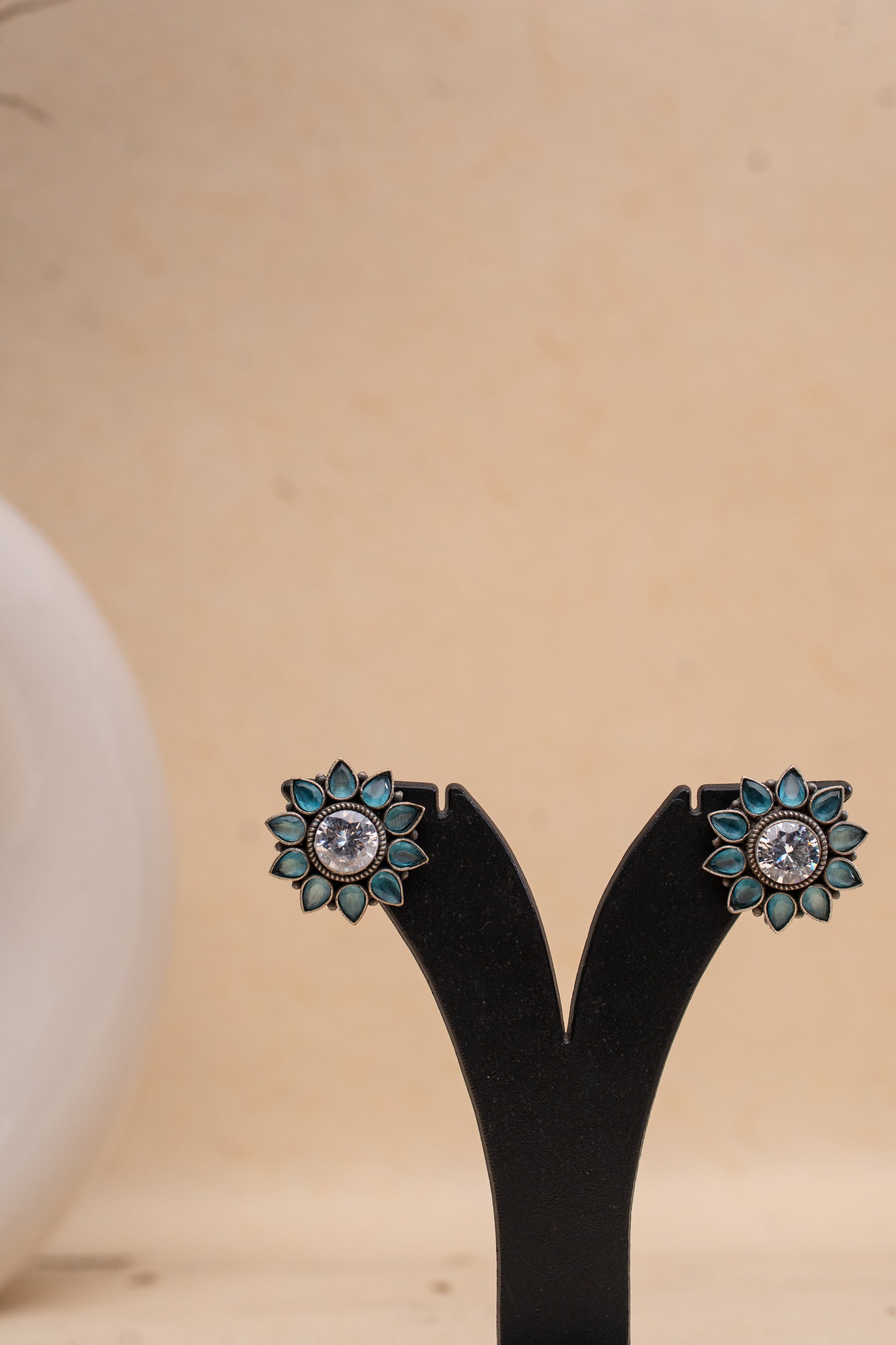These exquisite earrings feature a captivating oxidized turquoise finish, creating a rich, textured backdrop reminiscent of serene ocean depths. At the heart of each earring is a dazzling diamond, adding a brilliant contrast and a touch of timeless elegance. The combination of the deep turquoise tones and the sparkling diamond creates a sophisticated, eye-catching look. Perfect for adding a splash of color and a hint of luxury to any ensemble, these earrings are ideal for both special occasions and everyday elegance.