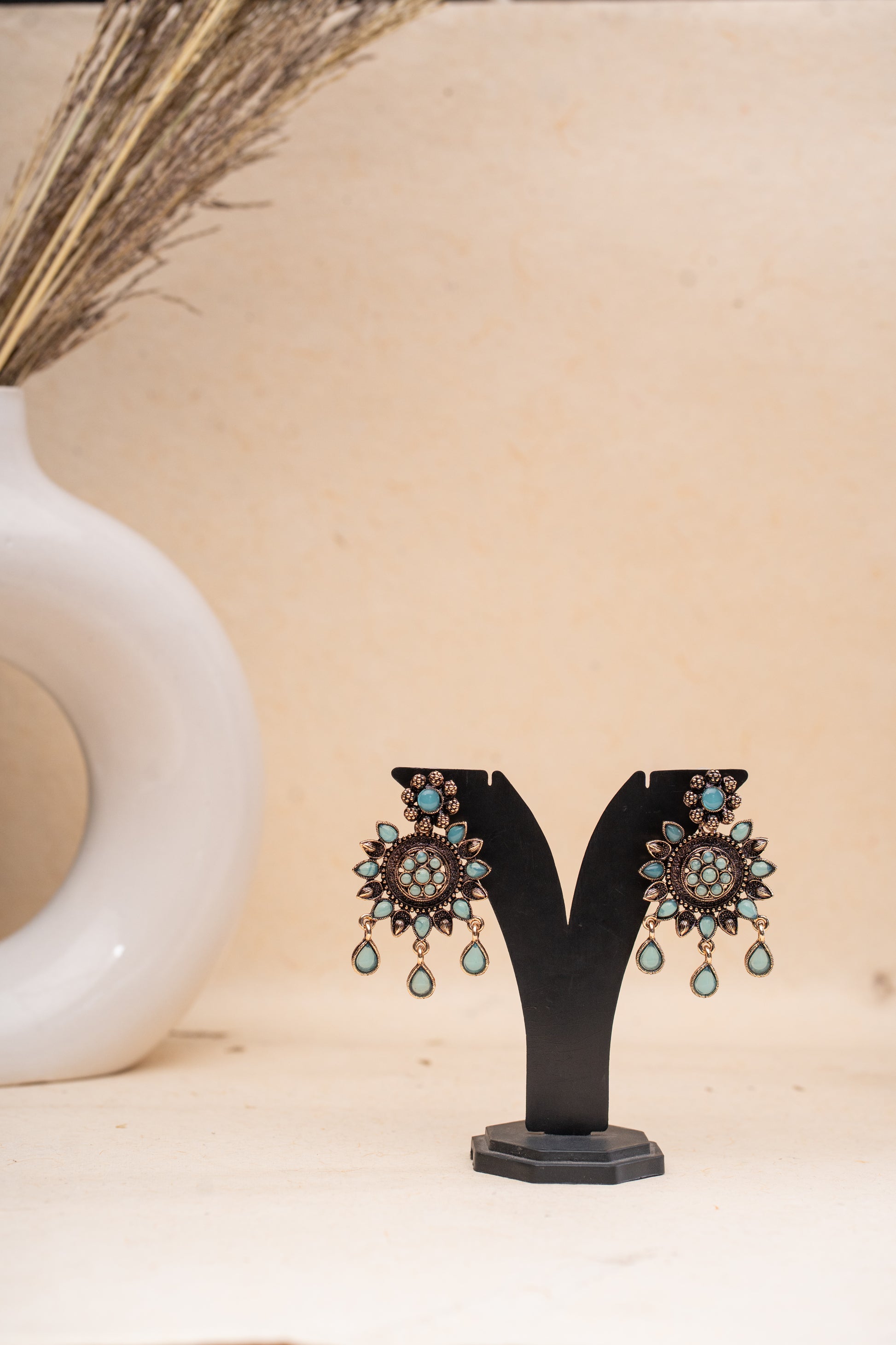 The soft mint green color contrasts beautifully with the darkened, vintage-inspired metal, creating a striking and sophisticated look. The drop design adds graceful movement and a touch of modern charm, while the oxidized finish provides a unique, antique feel. Perfect for adding a subtle pop of color and a hint of vintage elegance to both casual and formal outfits, these earrings are a versatile choice for any occasion.