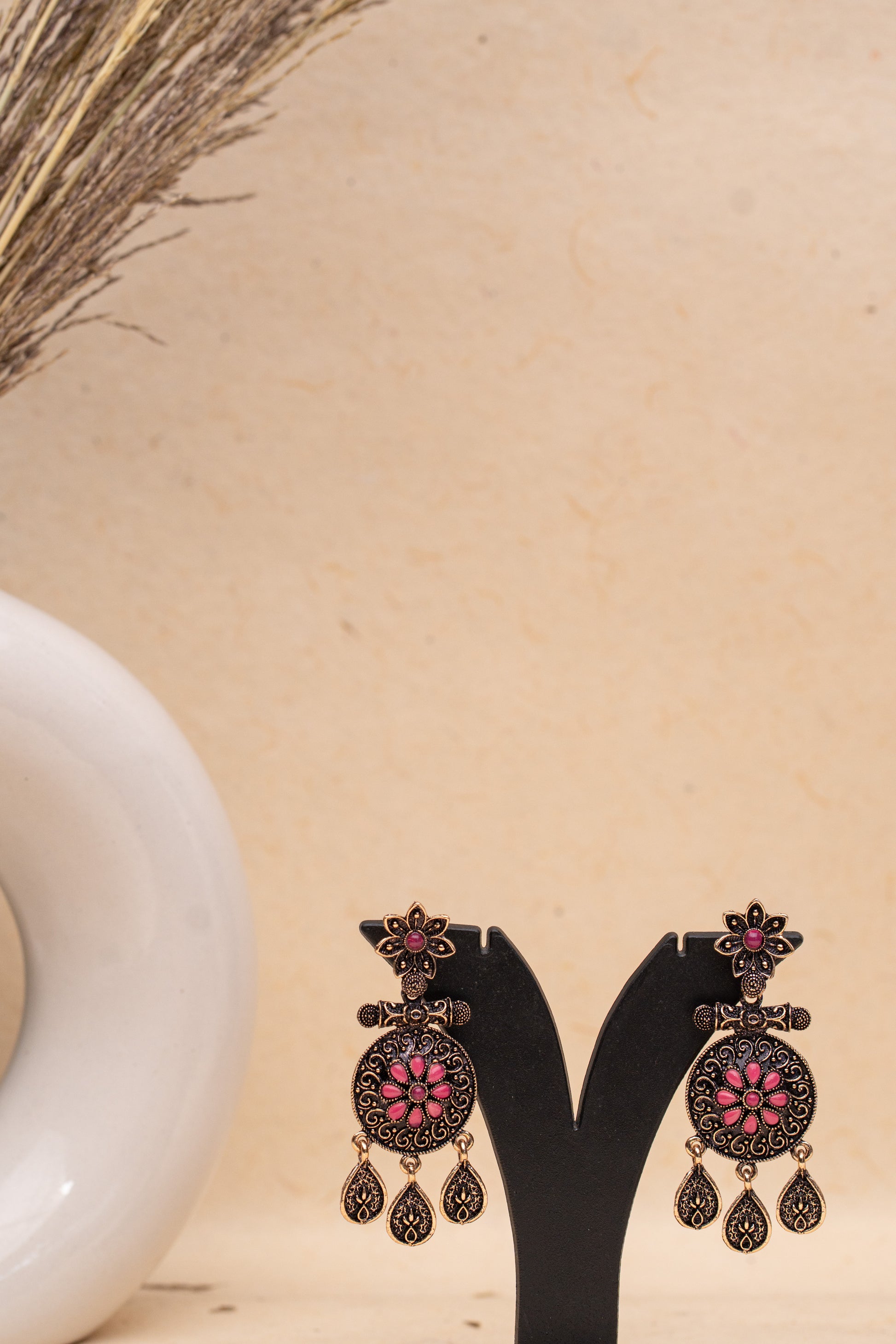 Infuse your look with a touch of timeless elegance with these oxidized pink drop earrings. Featuring a delicate pink hue that contrasts beautifully with the darkened, vintage-inspired metal, these earrings offer a sophisticated yet understated charm. The drop design allows for graceful movement and catches the light with every turn, highlighting the unique patina of the oxidized finish. Perfect for adding a subtle pop of color and a hint of vintage flair to any outfit, these earrings are a versatile choice for both everyday wear and special occasions.