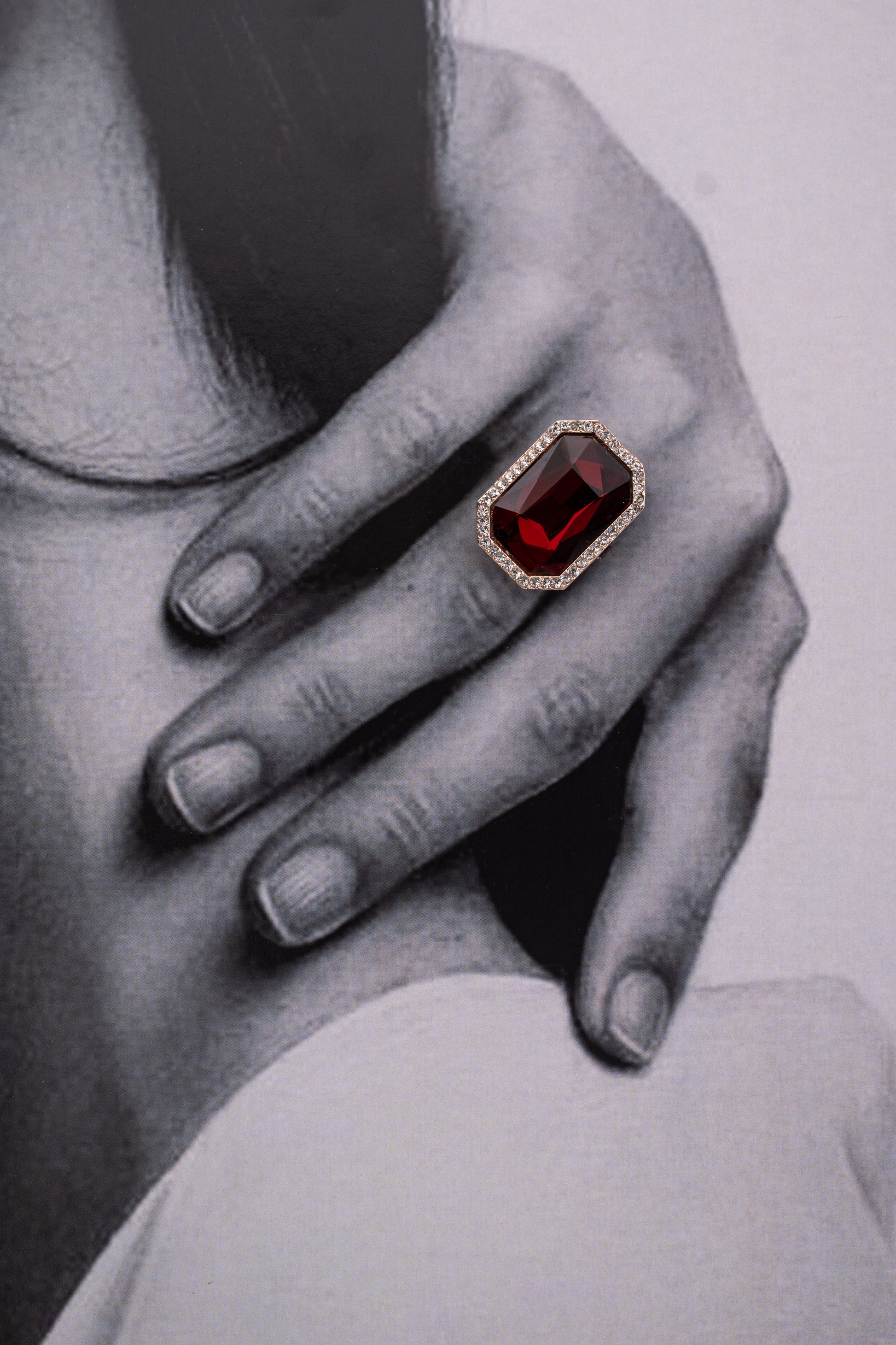The ring itself is worn on the hand, and its large size makes it a statement piece. The overall aesthetic of this ring combines elements of luxury and mystery, making it a captivating accessory for someone who enjoys unique and eye-catching jewelry.